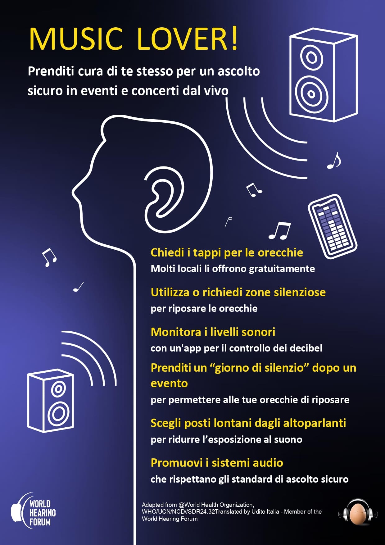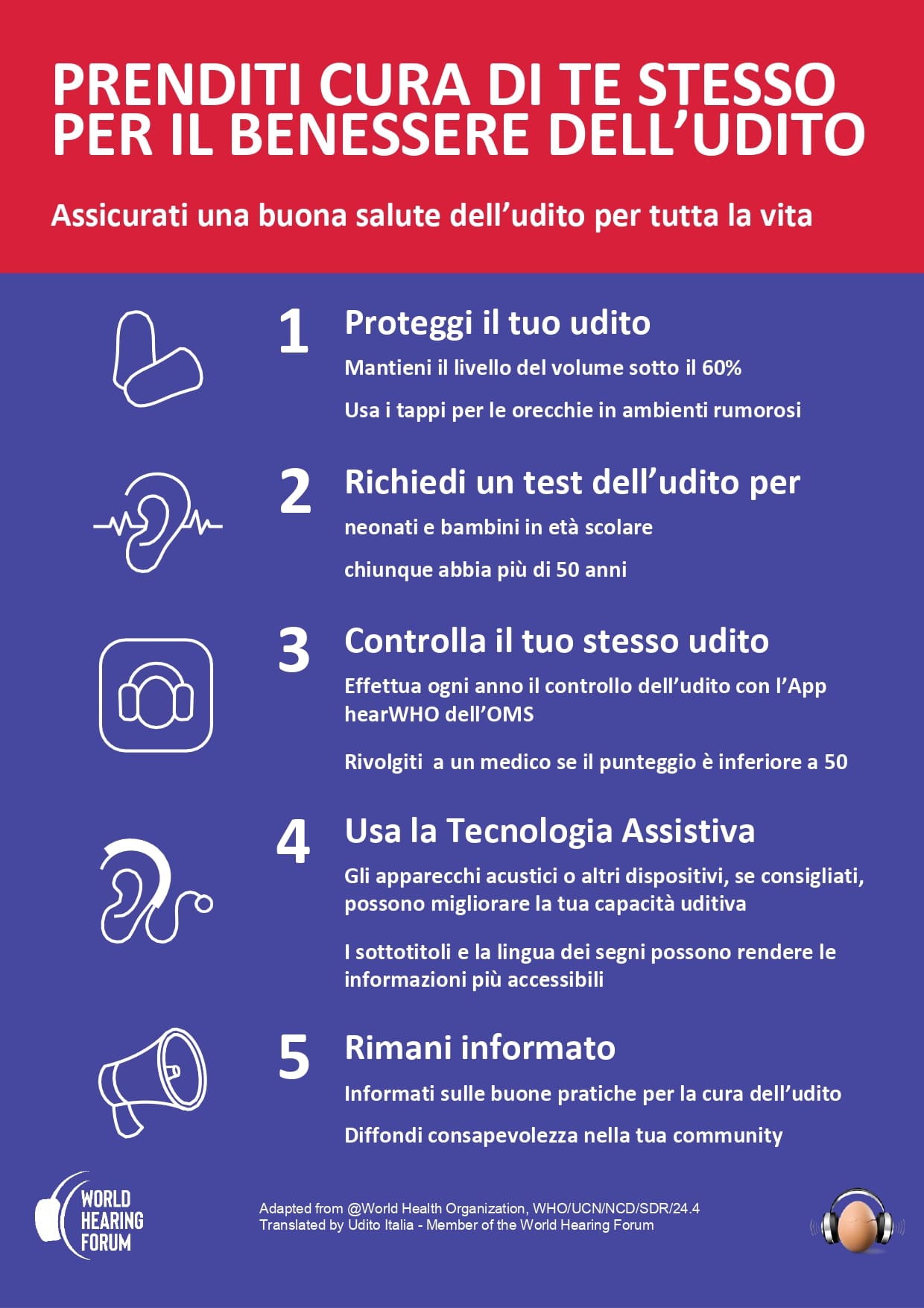 L’invito è a fare in modo che le persone di ogni età, siano in grado di garantire per se stesse la salute dell’udito. La campagna di quest’anno del WHF mira quindi a ispirare un cambiamento, partendo dal riconoscimento del valore individuale, indirizzando verso i giusti comportamenti: