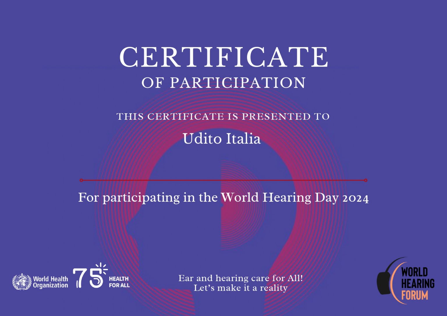 Anche quest’anno Udito Italia riceve il certificato di partecipazione al “World Hearing Day 2024” da parte del World Hearing Forum, organismo dell’OMS – World Health Organization.